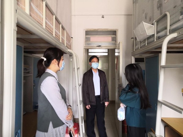 新冠肺炎疫情防控期间,学院领导十分关心留校学生的学习生活和身心情况,在走访留校学生宿舍时,袁书记、郑书记和王老师详细询问了留校学生目前的健康状况、心情状态和生活情况,在和同学们的交谈中叮嘱同学们:一是严格按照学习疫情防控要求,做好自我防护,平时注重个人卫生安全,戴口罩、勤洗手、多通风、少聚集;二是合理安排网课学习,将线上学习和自主学习相结合,勤学多思,做好学习规划;三是学会自我身心调节,适当进行体育锻炼,保持身心健康;四是平时多与家长、老师、同学们联系,有任何困难随时联系学院老师。