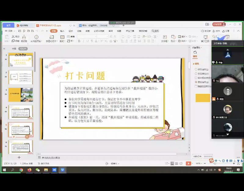 会议第一阶段是“开学前返校安排”。曾老师就开学时间及要求、健康打卡、返校当天安排、新生入学流程和党团关系的转移等问题详细地进行了说明,介绍了校方及院方的工作部署,为新老学生顺利返校作出指导。