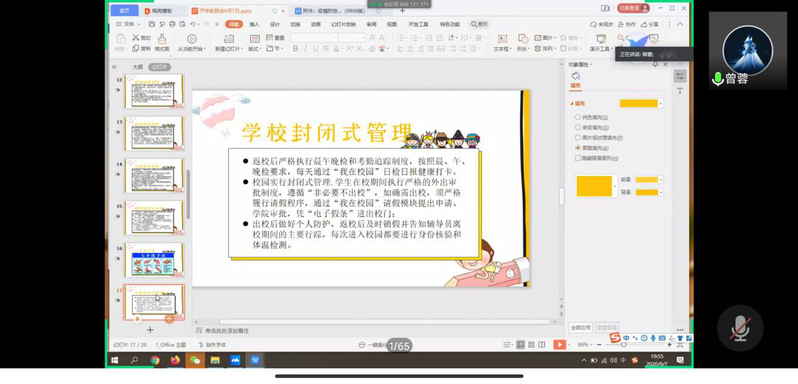 会议第二阶段是“疫情防控安排”。曾老师就学生防控保护、新冠病毒预防、预防性清洁消毒及学校封闭管理等内容进行讲解,她指出,“虽然目前疫情防控工作取得了战略性胜利,但切不可懈怠放松,仍需加强防疫工作的宣传和引导,在校师生需严格遵守疫情防控的相关管理要求,积极配合开展防疫工作。”