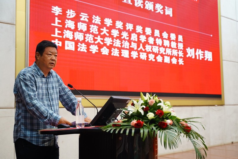 李步云法学奖评奖委员会委员、上海师范大学光启学者特聘教授、上海师范大学法治与人权研究所所长、中国法学会法理学研究会副会长刘作翔宣读汤姆·茨瓦特教授的颁奖词。(贺明 摄)