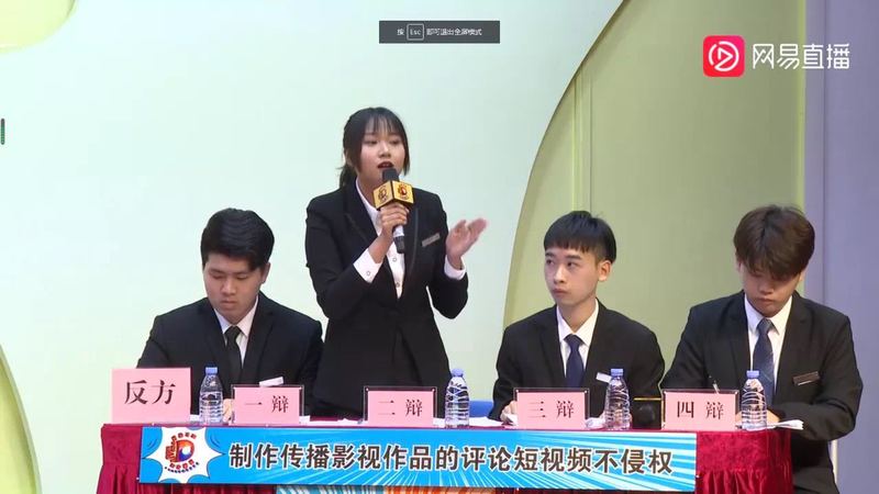 赛场上双方辩手就“制作传播影视作品的评论短视频是否侵权?”的辩题展开激烈辩论,华南师范大学持正方立场,我校持反方立场。我方二辩叶晓丹同学逻辑清晰,镇定自若,妙语连珠,荣获本场比赛的“最佳辩手”!